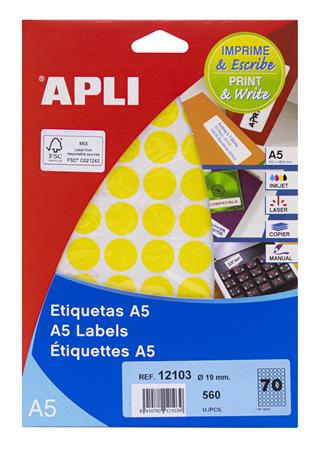 Etikett, 19 mm kör, színes, A5 hordozón, APLI, sárga, 560 etikett/csomag