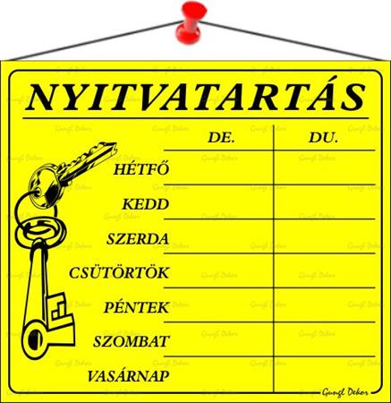 Információs tábla, 20x17,5 cm, "Nyitvatartás", sárga